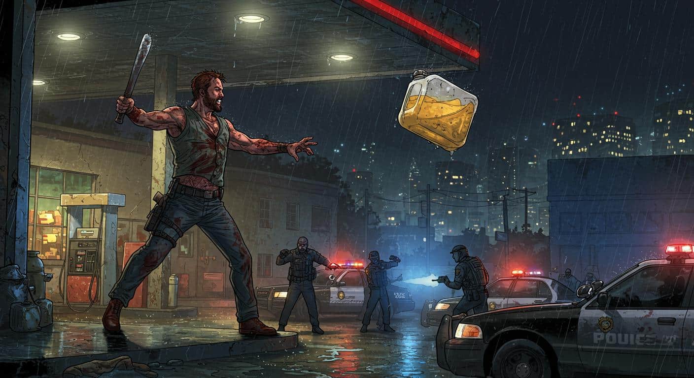 There’s a certain dour poetry in the phrase “man on top of gas station with machete throws urine.” It’s not every day one encounters a scene capable of upstaging the many technically-legal misadventures typically found wafting through the late-night southern air. What compels someone to swap terra firma for roof tiles, machete in hand, and weaponize bodily fluids? The mind wanders—though, as a general rule, the fewer gas station rooftops involved in one’s existential crises, the better.