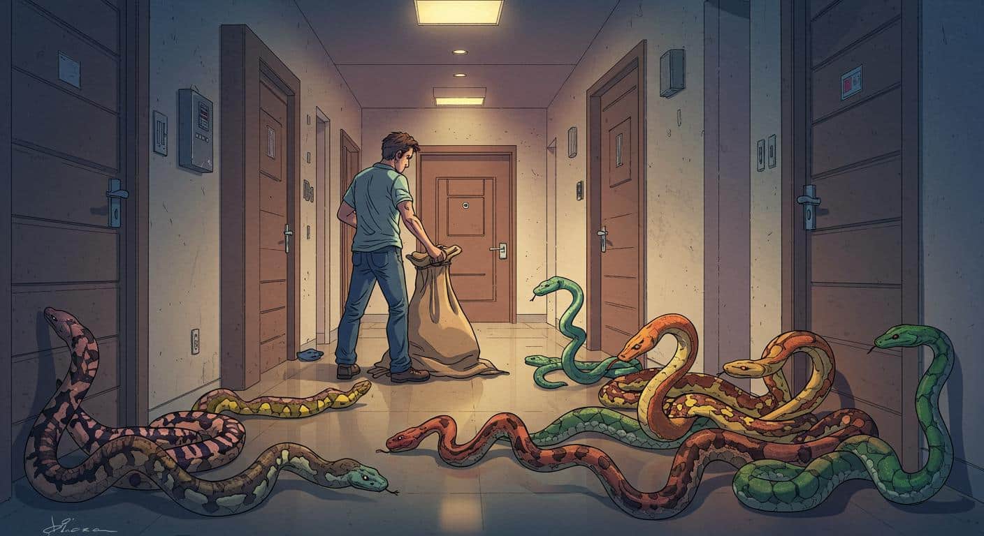 Reporting over the years, the resident expressed ongoing frustration to housing management about the persistent noise, but nothing changed. The Straits Times relates that, in a move that sidestepped conventional conflict resolution, the man released two large snakes in the corridor, filming their marble-floor explorations and even catching one coiled near a wooden door on video.